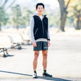 日本製のオリジナルボディは、フロントオープンのハイネックベスト。動きやすさを考慮して身幅にゆとりを持たせ、「POLARTEC® Alpha Direct」をダイヤ型にキルティング。フロントファスナーは上下に開く逆開タイプで、開閉することで蒸れや体温を調整可能。裾はドローコードでフィット感を調整。