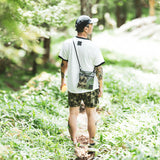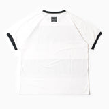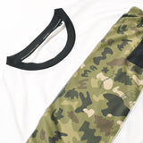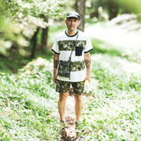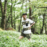日本製のオリジナルボディは、ネックと袖先に縁取りのあるトリムTシャツ。POPでレトロ感のある雰囲気がPOCHOMAN CAMOとマッチしている。アクティビティとタウンユースの両方に対応するタイト過ぎずリラックス過ぎないレギュラーシルエット。吸水速乾機能のCOOLMAX®メッシュに機能を損なわない昇華転写でプリントしたカモ柄をボーダー状に縫う凝った仕様。デザインのアクセントと共に通気性が向上している。