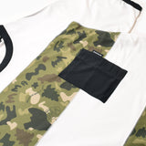 アウトドアカテゴリーの広告やカタログを手がける人気アートディレクターのジェリー鵜飼氏とMOUNTAIN MARTIAL ARTSのコラボレーション。ジェリー鵜飼氏が生み出したPOPなオリジナルカモフラージュ柄「PONCHOMAN CAMO」シリーズ。ボーダーに切り替えたラグランTシャツ。