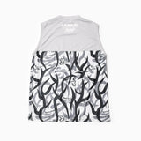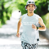 ランニングイベントのMC、PODCAST「ランラジ」パーソナリティとして人気の岡田拓海さん(タクミくん)。フルマラソンサブスリー、100マイルトレイル完走とガチな実力の持ち主ながら、明るいキャラクターでランニングの楽しさを伝えている。タクミくんのランラジロゴをトライバルカモにアレンジ。背中をメッシュで切り替えたスリーブレス。